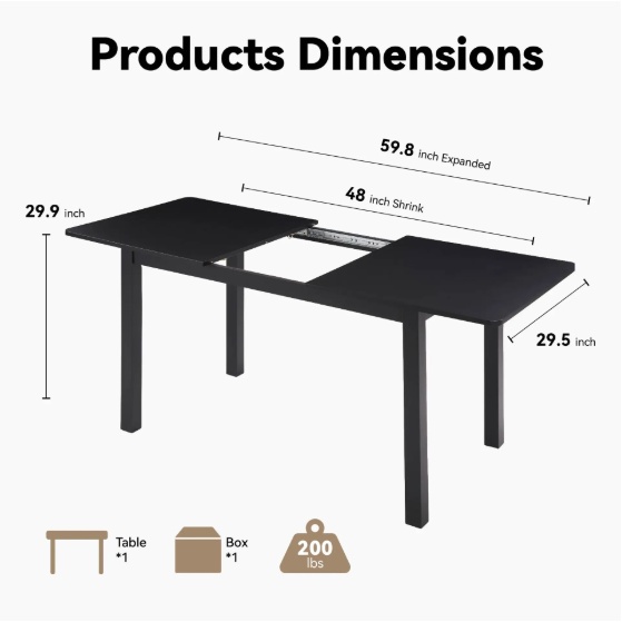 Product Name: 59‘’ Extendable Dining Table, Modern House Dining Room Table for 4-8, Wooden Kitchen Table , Dining Room, Working Office, Home Living Room Furniture for Small Space, Black