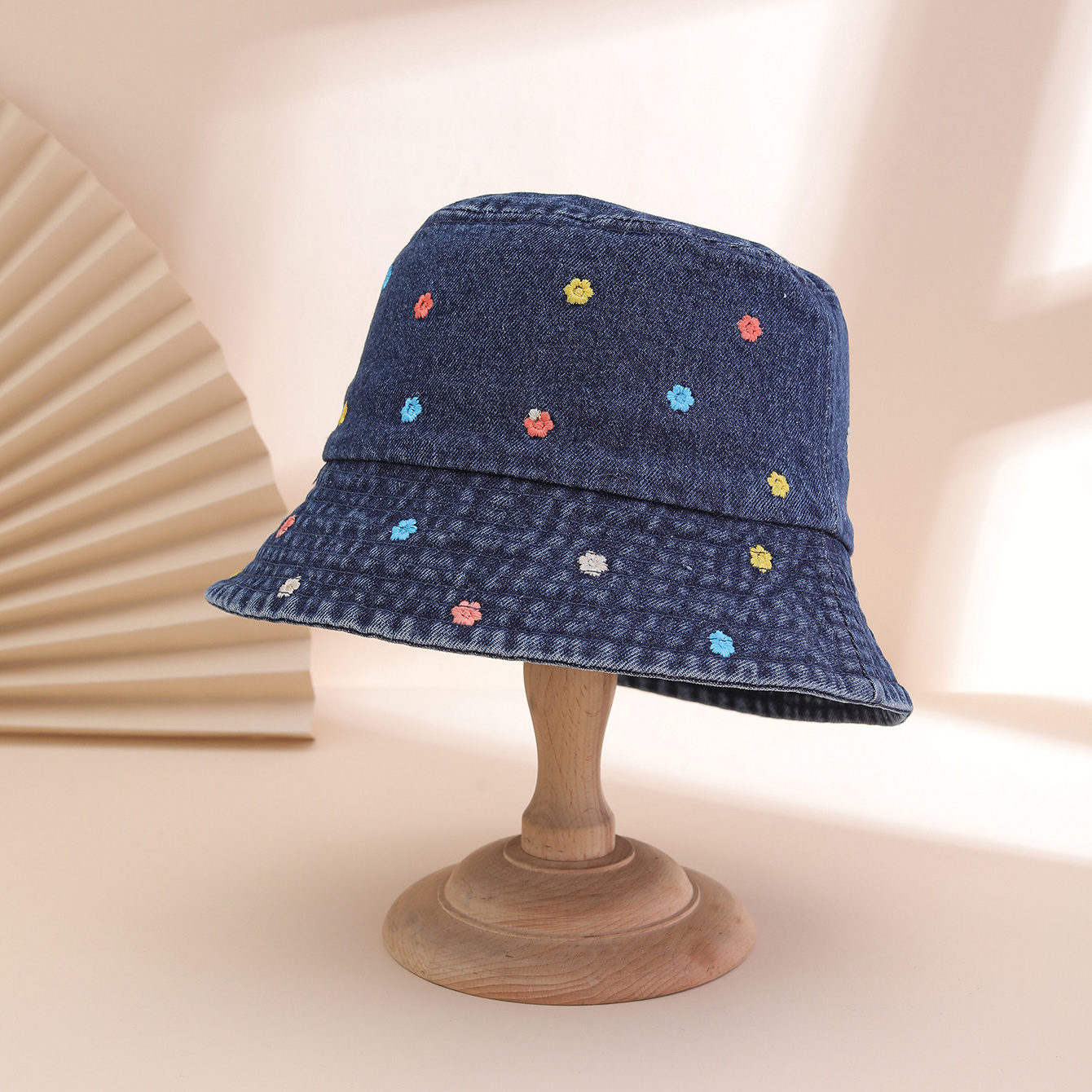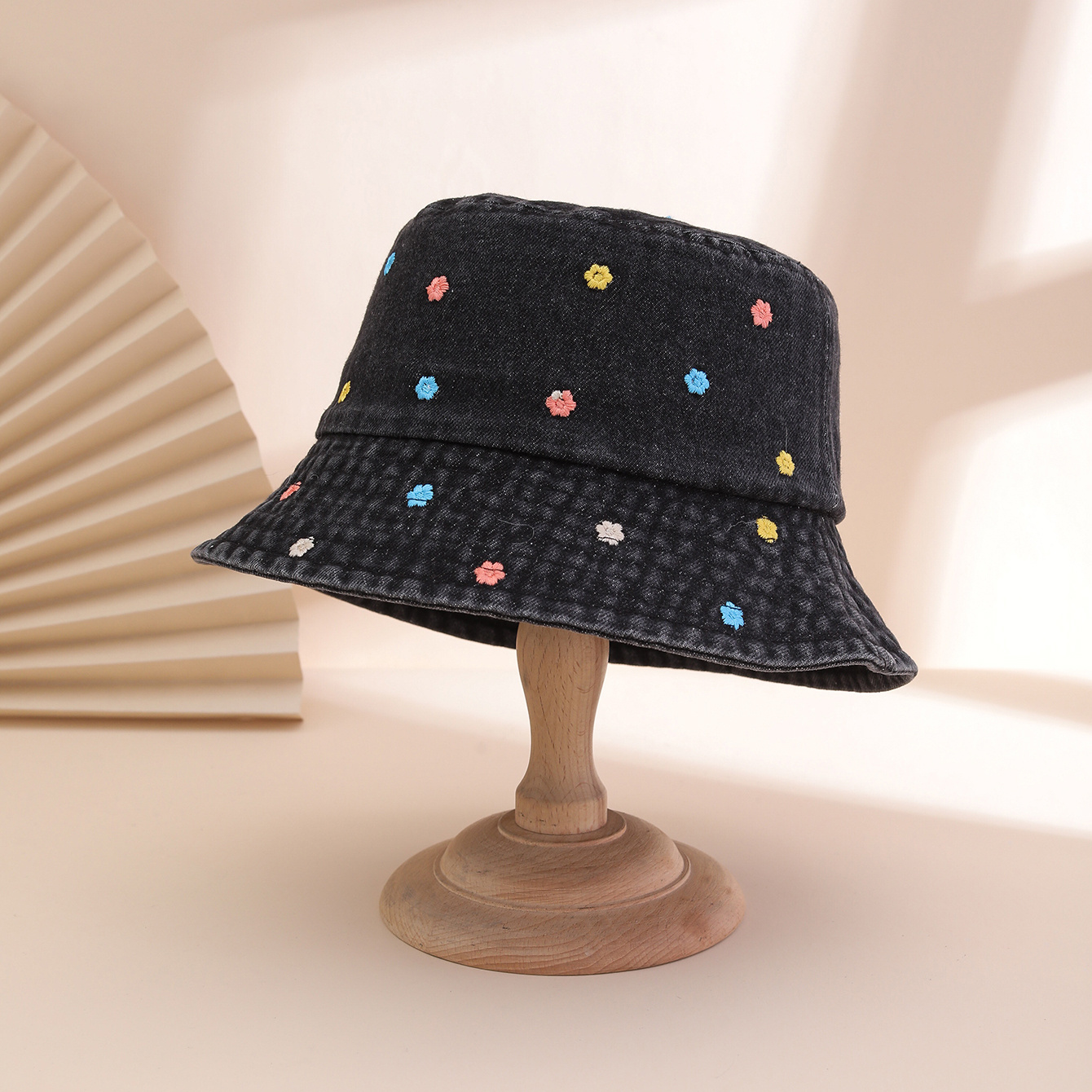 Korean-style Water-washed Embroidered Full-pattern Small Floral Fisherman Hat, Energetic And Cute Flat-top Cap, Suitable For Outdoor Wear.