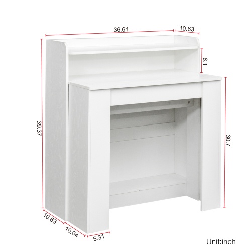 Featuring an understated silhouette with clean lines, this extendable dining table brings a modern flair to your home Keep the table leaves completely extending, it turns into a spacious dining table . When it’s not in use, you can use it as a sideboard with storage.Expanded Table Dimensions: 36.61L x 98.43W x 39.37H in This dining table fits easily in smaller spaces, while its neutral finish helps it blend with your existing arrangement. Suitable for Kitchen, Living Room, Dining Room, Small Apartment, Cafe,Restaurant,Home Office. Material:Material is 15mm particle bpard,back board is 3mm MDF. Made of wooden structure with melamine finish for durability and easy maintenance. Aufgrund des Lichts oder der Anzeige kann die Farbe des tatsƤchlichen Produkts geringfügig vom Bild abweichen.